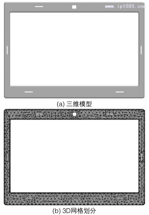 薄壁塑件是指流長厚度比,即熔體從進入模具到型腔最遠點的流動長度與塑件平均壁厚之比在 100或150以上的塑件(或厚度小于1 mm,同時投影面積在50 cm2 以上的塑件)。本研究以某品牌筆記本電腦顯示器外殼作為分析模型(如圖1所示),其外尺寸為340 mm×230 mm×1.5 mm,內(nèi)尺寸為310 mm×175 mm×1.5 mm,屬于薄壁塑件。在Pro/E 中建立該顯示器外殼三維模型(圖1(a)),然后導入CAD Doctor對其進行修復,再把修復后的模型導入Moldflflow中進行3D網(wǎng)格劃分(圖1(b))。該模型的四面體數(shù)為57 628,節(jié)點數(shù)為10 752,最大縱橫比為28.26%,在允許范圍內(nèi)。