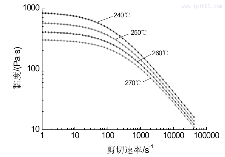 考慮到筆記本電腦顯示器外殼對機械強度、散熱效果、質(zhì)量和光澤度等的要求,選用工程塑料 PC+ABS(聚碳酸酯與丙烯腈-丁二烯-苯乙烯共聚物的共混物),由該材料制備的顯示器外殼具有壁薄、質(zhì)輕、強度高、散熱快、屏蔽好等突出優(yōu)點[5]。本實驗選用牌號為Baybtend FR3001的PC+ABS材料,該材料的推薦模具表面溫度為70℃、熔體溫度為260℃,材料流動性較好,其黏度曲線如圖2所示。