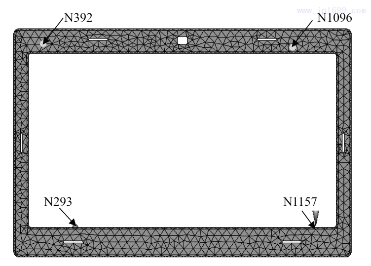 顯示器外殼塑件較薄且面積較大,故采用一 模一腔,4個澆口進料。通過Moldflflow 2018軟件進行分析,最終確定的最佳澆口位置為N392、N293、N1096、N1157,如圖3所示。