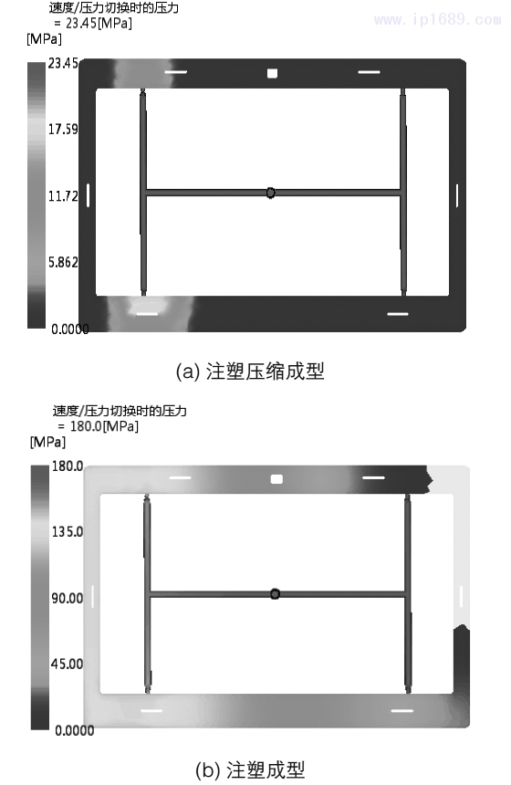 (1)與普通注塑成型工藝相比,注塑壓縮成型在V/P切換時的壓力減小了87