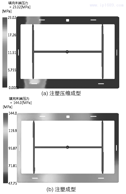 型相比,注塑壓縮成型型腔可以自動調(diào)整,在注塑過程中所需壓力較小。圖6為上述兩種成型工藝的填充末端壓力模流分析結果。從圖6可以看出,注塑壓縮成型的填充末端壓力最大值為23.02 MPa,其制品在低壓狀態(tài)下完成充填,而注塑成型的填充末端壓力最高達到144 MPa。