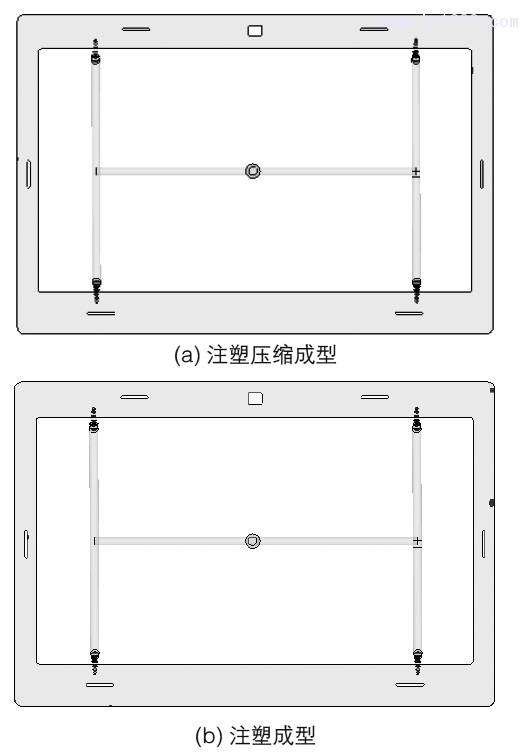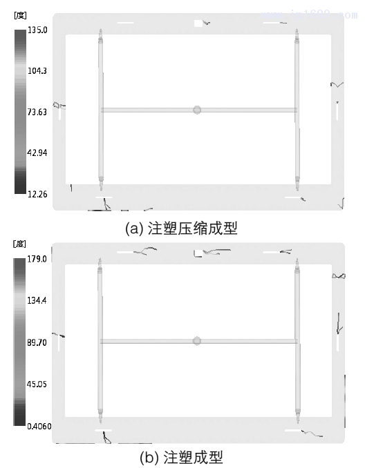 充模過程中,兩股相向或平行的熔體前沿相遇,就會形成熔接線。通常兩股匯合熔體前端的夾 角(匯合角)越小,產(chǎn)生的熔接線越明顯。熔接線是 常見的塑件缺陷,其存在不僅影響制品外觀質(zhì)量,而且對制品的力學性能影響很大。從圖10可以看出,注塑壓縮成型產(chǎn)生的熔接線明顯少于注塑成型。