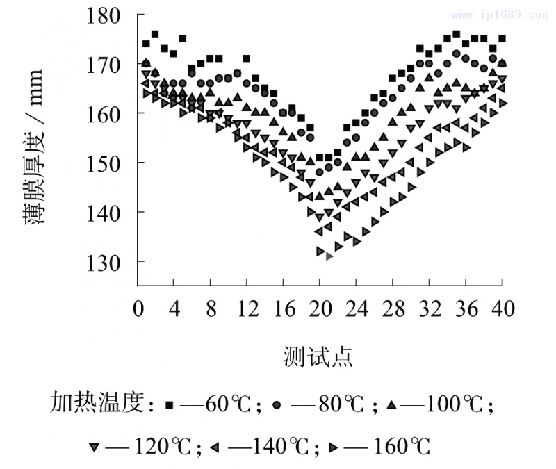 以 某 產(chǎn) 品 成 型 件 為 例 ,將 其 沿 周 向 切 開 ,選 取 40 個測量點,如圖 3 所示,分別測量這 40 個點所在位置的壁厚。成型件薄膜的原始厚度為 0.25 mm,選用千分尺作為測量工具。為了減小誤差,每個點 需要進行兩次測量然后取平均值,記錄并統(tǒng)計各個 溫度下壁厚的測量值。不同加熱溫度下高壓成型件 壁厚的分布如圖 4 所示,其減薄率數(shù)據(jù)列于表 1。