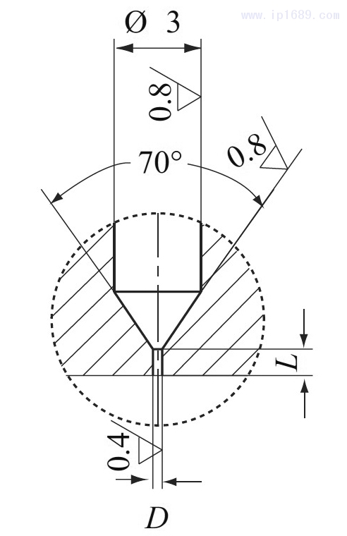 根據(jù)課題組之前的研究表明[7],PE-UHMW/PE-HD共混物熔融紡絲過程中圓柱形擠出口模長(zhǎng)徑比L/D為5,口模直徑D為0.6mm,口模收斂角為70°時(shí),初生絲具有較好的擠出穩(wěn)定性,同時(shí)模具也容易被清理,因此選用該結(jié)構(gòu)的噴絲板,其物理模型如圖1所示。