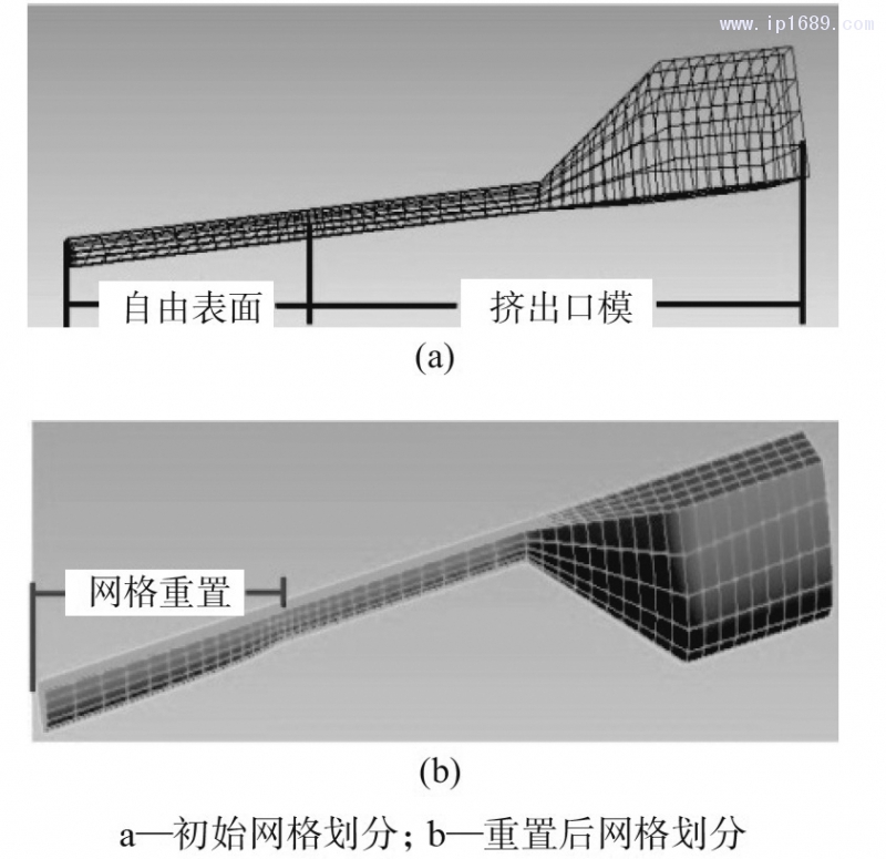 圖3a顯示是初始網(wǎng)格劃分,共劃分單元3096個(gè),節(jié)點(diǎn)4420個(gè),邊界6個(gè),鄰域2個(gè)。擠出過程中,物料在擠出口模后,會(huì)發(fā)生擠出脹大現(xiàn)象,因此模擬過程中會(huì)發(fā)生網(wǎng)格重置現(xiàn)象,如圖3b所示。