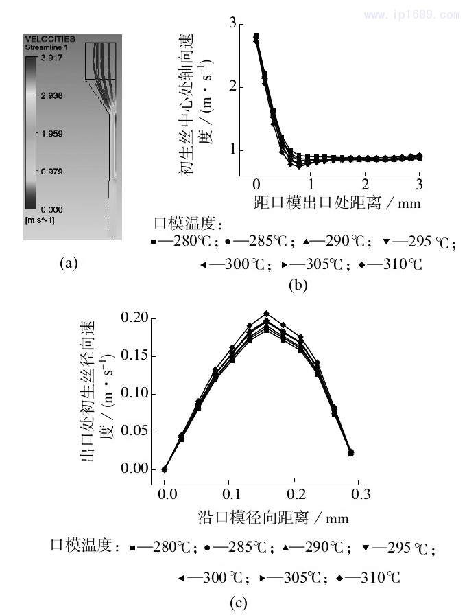 速度分布;c—熔體泵轉(zhuǎn)速為2r/min時(shí),不同口模溫度下出口處初