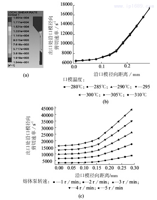 口模溫度下出口處初生絲徑向剪切速率分布;c—300℃時(shí),不同熔體