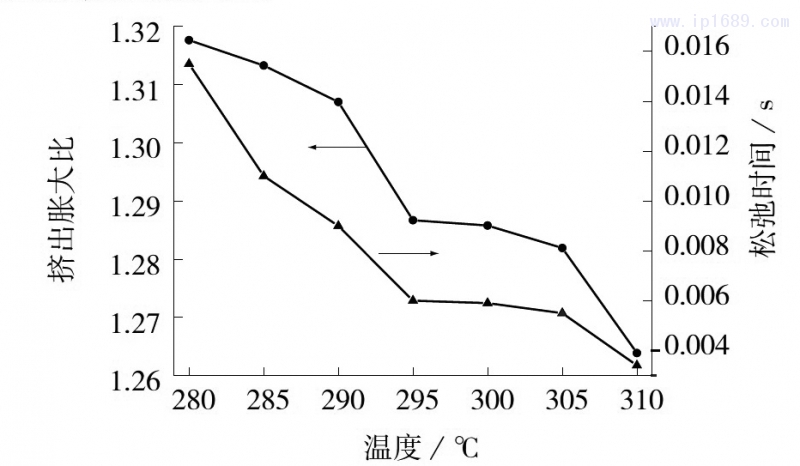 (1)在一定的溫度范圍內(nèi),初生絲的擠出脹大比隨擠出口模溫度的升高而降低,由1.318(280℃)減小到1.264(310℃);