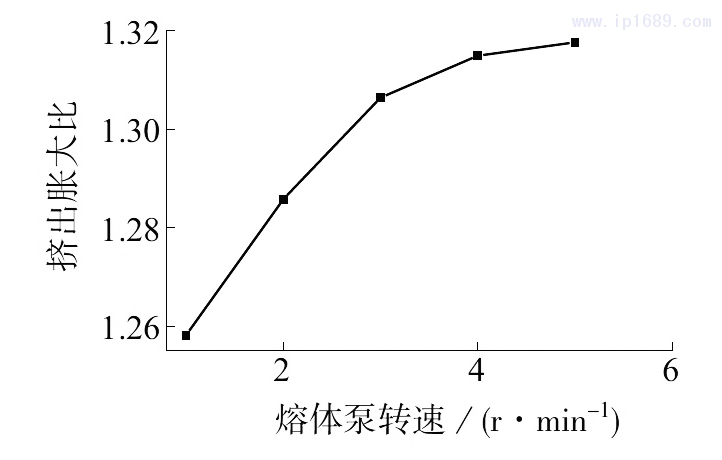 (2)熔體泵轉(zhuǎn)速對(duì)擠出脹大比的影響。
