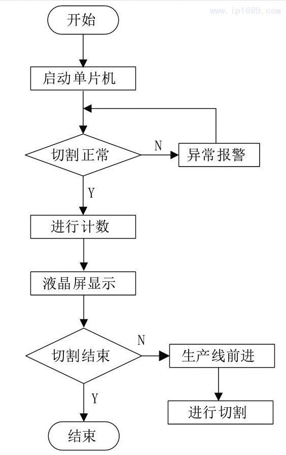 (3)每完成一次切割動(dòng)作,單片機(jī)即通過液晶屏對當(dāng)前狀態(tài)進(jìn)行顯示,同時(shí)進(jìn)行一次計(jì)數(shù),并判斷整個(gè)管材是否切割完成,在此過程中若出現(xiàn)切割異常情況,則會啟動(dòng)報(bào)警裝置。