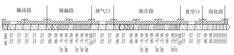 1)雙螺桿擠出機(jī)生產(chǎn)聚乙烯護(hù)套料時(shí)宜用 中、高轉(zhuǎn)速生產(chǎn),螺桿的熔融段應(yīng)以強(qiáng)剪切為主,如 45°厚剪切塊、90°剪切塊,配合反向輸送塊進(jìn)行組 合設(shè)計(jì);混合段以分散、分布組合為主,如45°的薄、 厚剪切塊組合設(shè)計(jì)。