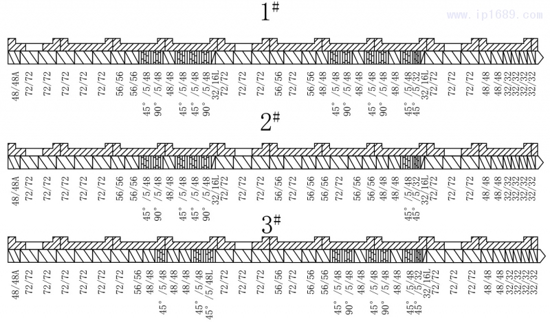 針對(duì)熔融段和混合段,設(shè)計(jì)了3種不同的螺桿 組合,如圖2所示。