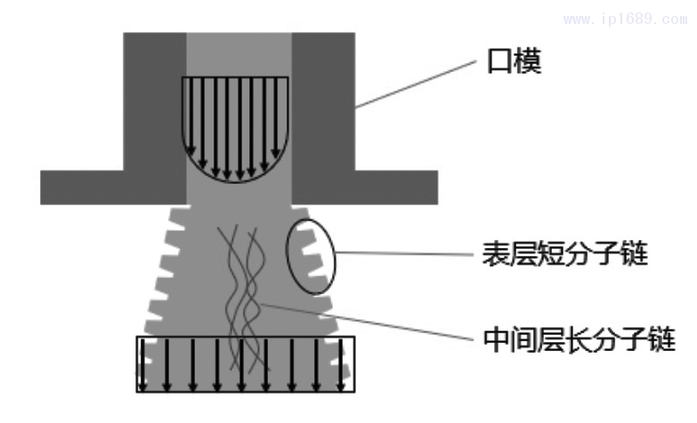 (3)不同分子鏈長度的黏彈性不一樣,短鏈分 子鏈集中在口模壁一側(cè),長鏈分子鏈集中在中間 層。短鏈回彈大,當(dāng)其離開口模后,表層的短鏈分 子鏈回彈大,中間層的長鏈分子回彈小,從而引起 竹節(jié)缺陷。