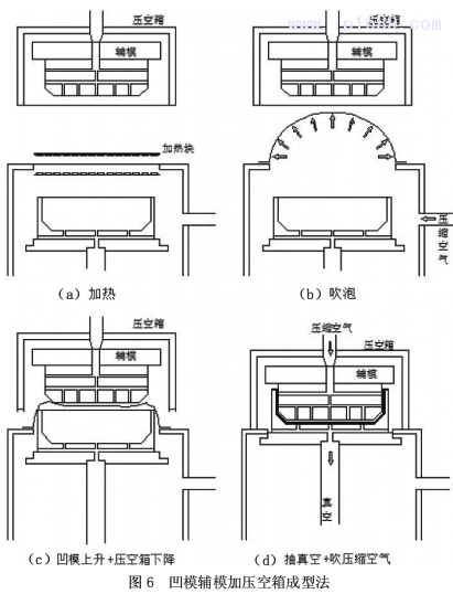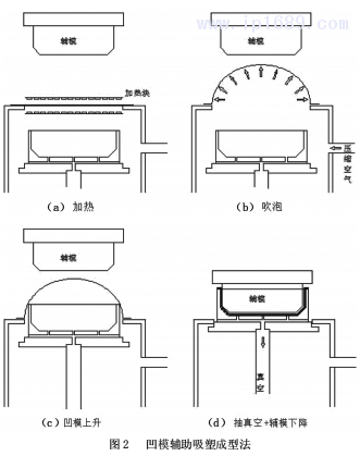 該法的成型方式與凸模吹泡真空成型法類(lèi)似,同樣經(jīng)過(guò)加熱,吹泡,模具上升,抽真空等階段。但是,模具采用凹模,并且在抽真空時(shí), 模具上方加以輔模作為輔助手段,幫助成型更復(fù)雜的形狀。