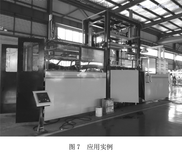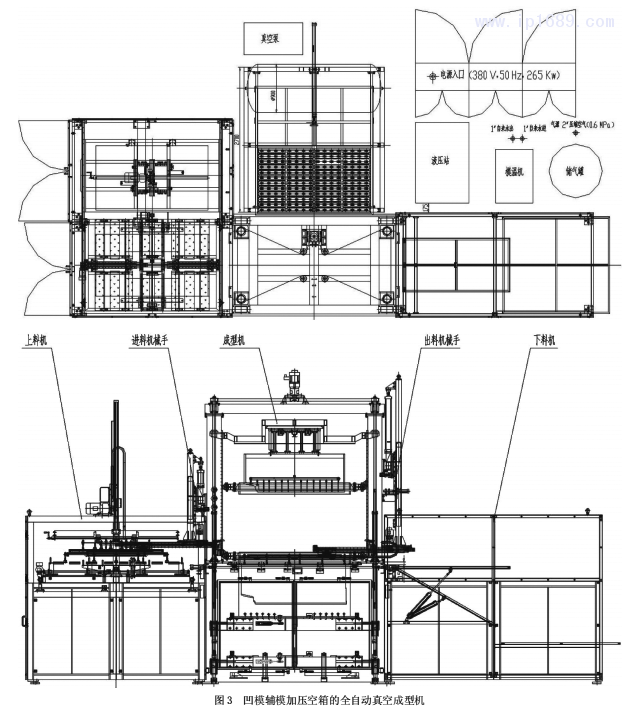 這種真空成型機(jī),不僅采用新型的凹模輔模加壓空箱的方法,而且在單工位的基礎(chǔ)上,加上自動(dòng)上下料機(jī)械手。與傳統(tǒng)的單工位真空成型機(jī)相比,其自動(dòng)化程度更高,不需人工上下料,節(jié)省了人力和物力。在人力成本日益高漲的今天,能更好的節(jié)約運(yùn)行成本。而與傳統(tǒng)的三工位真空成型機(jī)相比,其設(shè)備成本又低很多,僅為傳統(tǒng)三工位的 40 %。全自動(dòng)真空成型機(jī)如圖 3。