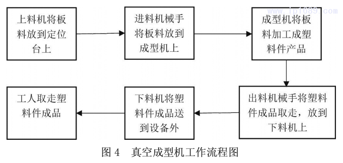 其組成主要有:上料機(jī),進(jìn)料機(jī)械手,成型機(jī),出料機(jī)械手,下料機(jī)。它的成型工藝如圖 4 所示。
