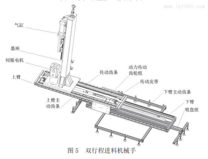 進(jìn)料機(jī)械手的作用是板料送入成型機(jī)中。該機(jī)械手采用獨(dú)特的雙行程結(jié)構(gòu)(圖5),一個(gè)動(dòng)力驅(qū)動(dòng)兩個(gè)行程。其特點(diǎn)是結(jié)構(gòu)緊湊,不需要太多的空間。