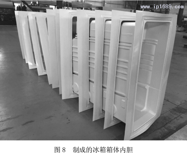 設(shè)備在實(shí)際使用過(guò)程中,自動(dòng)化程度高,不需要工人上下料,工人只負(fù)責(zé)取走產(chǎn)品,并且生產(chǎn)節(jié)拍達(dá)到設(shè)計(jì)參數(shù)。所生產(chǎn)的冰箱內(nèi)膽,深度465mm。一般這個(gè)深度的內(nèi)膽,都需要使用3.6mm厚的HIPS 板,目前廠家只使用2.8mm的板。但是所制成的塑料件如圖7、圖8,可見(jiàn) 成型效果很好,大大節(jié)約了生產(chǎn)成本,最終得到廠家的好評(píng)。