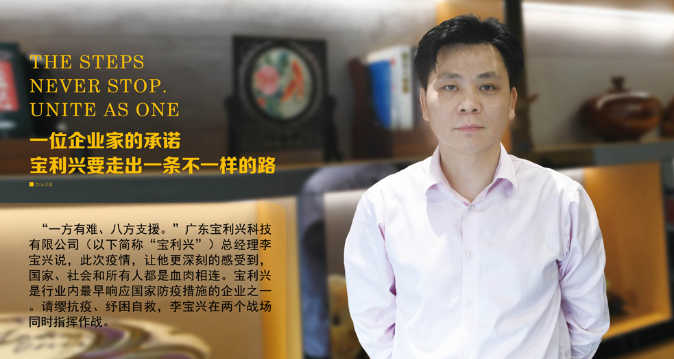 “一方有難、八方支援。”廣東寶利興科技有限公司(以下簡稱“寶利興”)總經(jīng)理李寶興說,此次疫情,讓他更深刻的感受到,國家、社會和所有人都是血肉相連。寶利興是行業(yè)內(nèi)最早響應(yīng)國家防疫措施的企業(yè)之一。請纓抗疫、紓困自救,李寶興在兩個(gè)戰(zhàn)場同時(shí)指揮作戰(zhàn)。