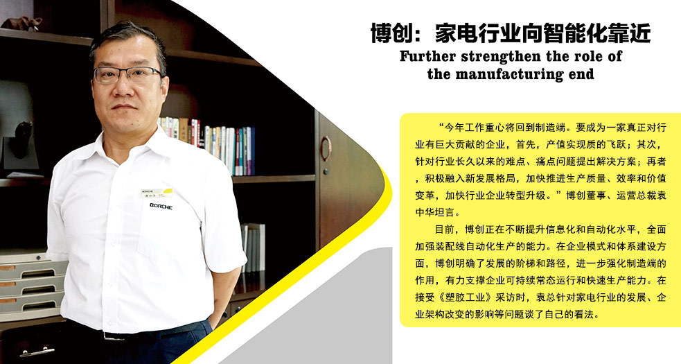 目前,博創(chuàng)正在不斷提升信息化和自動化水平,全面加強裝配線自動化生產的能力。在企業(yè)模式和體系建設方面,博創(chuàng)明確了發(fā)展的階梯和路徑,進一步強化制造端的作用,有力支撐企業(yè)可持續(xù)常態(tài)運行和快速生產能力。在接受《塑膠工業(yè)》采訪時,袁總針對家電行業(yè)的發(fā)展、企業(yè)架構改變的影響等問題談了自己的看法。