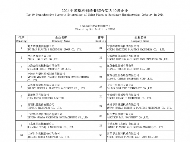 根據(jù)各單位上報的2023年度資料,經(jīng)相關(guān)部門審查和核實,確定出“2024中國塑機制造業(yè)綜合實力40強企業(yè)”、“2024中國塑料注射成型機行業(yè)18強企業(yè)”、“2024中國塑料擠出成型機行業(yè) 14 強企業(yè)”、“2024中國塑料中...