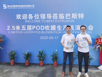 今日,佛山巴斯特科技股份有限公司(以下簡稱“巴斯特”)2.5米5層POD吹膜生產(chǎn)線演示會在巴斯特工廠裝配車間隆重舉行。