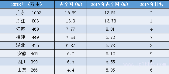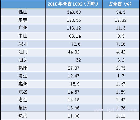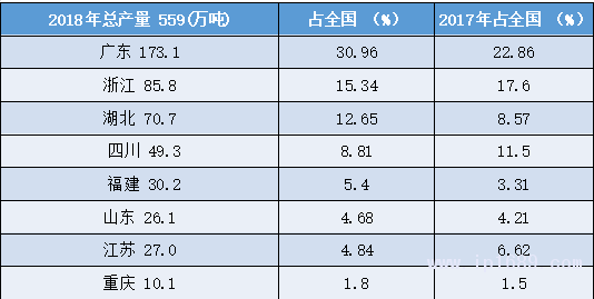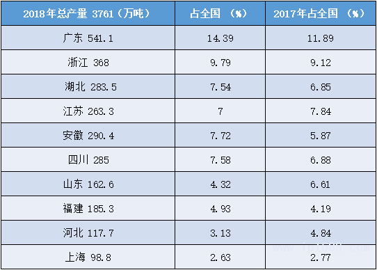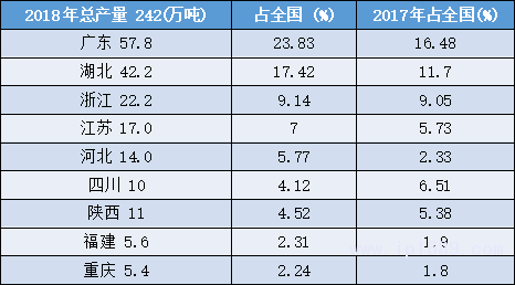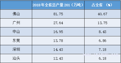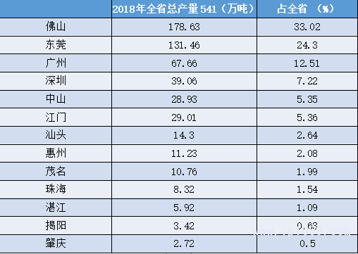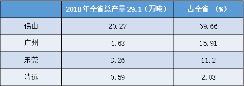 佛山、東莞、廣州等大灣區(qū)城市是主產區(qū),佛山的產量占全國約4.75%,可排在省份第7。東莞的產量占全國3.5%,可排在同期省份第11 。