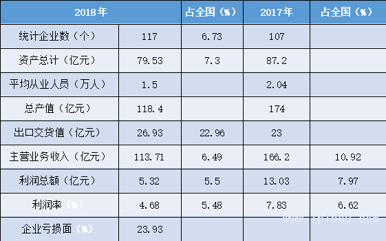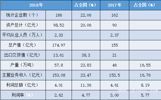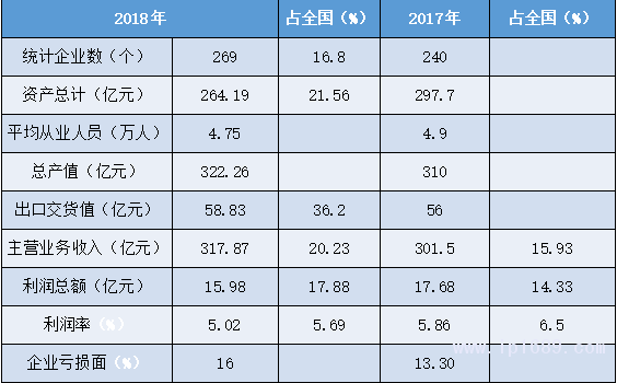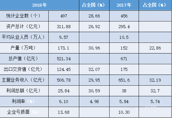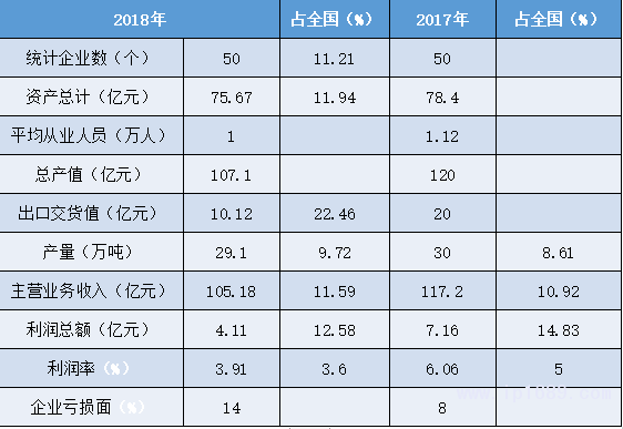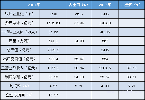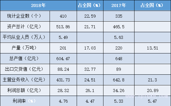 從業(yè)人員數(shù)量大,企業(yè)虧損面增大。產量占全國比重有所提升,產值、主營業(yè)務收入、利潤總額數(shù)據(jù)均有較大下降,利潤率略有提升,高于全國平均。