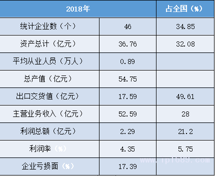 產品出口交貨值占比重大,主營業(yè)務收入、利潤總額占全國比重提升;企業(yè)虧損面增大,利潤率下降,其他數(shù)據(jù)平穩(wěn)。