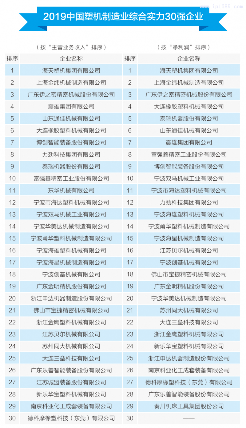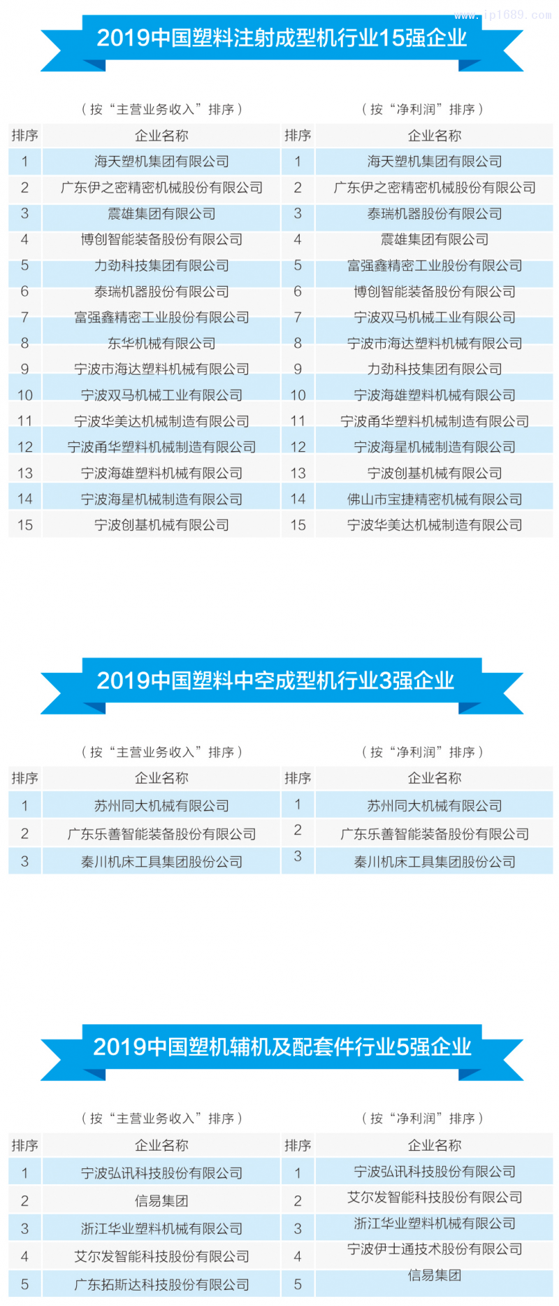2019年中國塑料機械行業(yè)組織的優(yōu)勢企業(yè)評選活動(參見中塑機協(xié)〔2019〕11號文)是由中國塑料機械工業(yè)協(xié)會組織的一次范圍廣和規(guī)模大的品牌綜合實力排名評選活動。中國塑料機械工業(yè)協(xié)會本著“公平、公正、自愿”的原則,對各單位上報的2018年度資料進行核實后,分別以“主營業(yè)務(wù)收入”和“凈利潤”為主要經(jīng)濟指標(biāo)進行排序。確定出“2019中國塑機制造業(yè)綜合實力30強企業(yè)”“2019中國塑料注射成型機行業(yè)15強企業(yè)”“2019中國塑料擠出成型機行業(yè)10強企業(yè)”“2019中國塑料中空成型機行業(yè)3強企業(yè)”和“2019中國塑機輔機及配套件行業(yè)5強企業(yè)”入選名單。