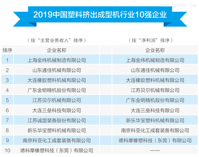“2019中國塑料擠出成型機行業(yè)10強企業(yè)”的第一名仍舊是上海金緯機械制造有限公司;“2019中國塑料中空成型機行業(yè)3強企業(yè)”的榜首也依舊由蘇州同大機械有限公司摘取,與2018相同的是前三甲穩(wěn)坐江湖寶座;“2019中國塑機輔機及配件行業(yè)5強企業(yè)”則是由寧波弘訊科技股份有限公司兩年摘得桂冠。而艾爾發(fā)智能科技股份公司在“凈利潤”排名中有過去的榜尾順利沖向第二名。
