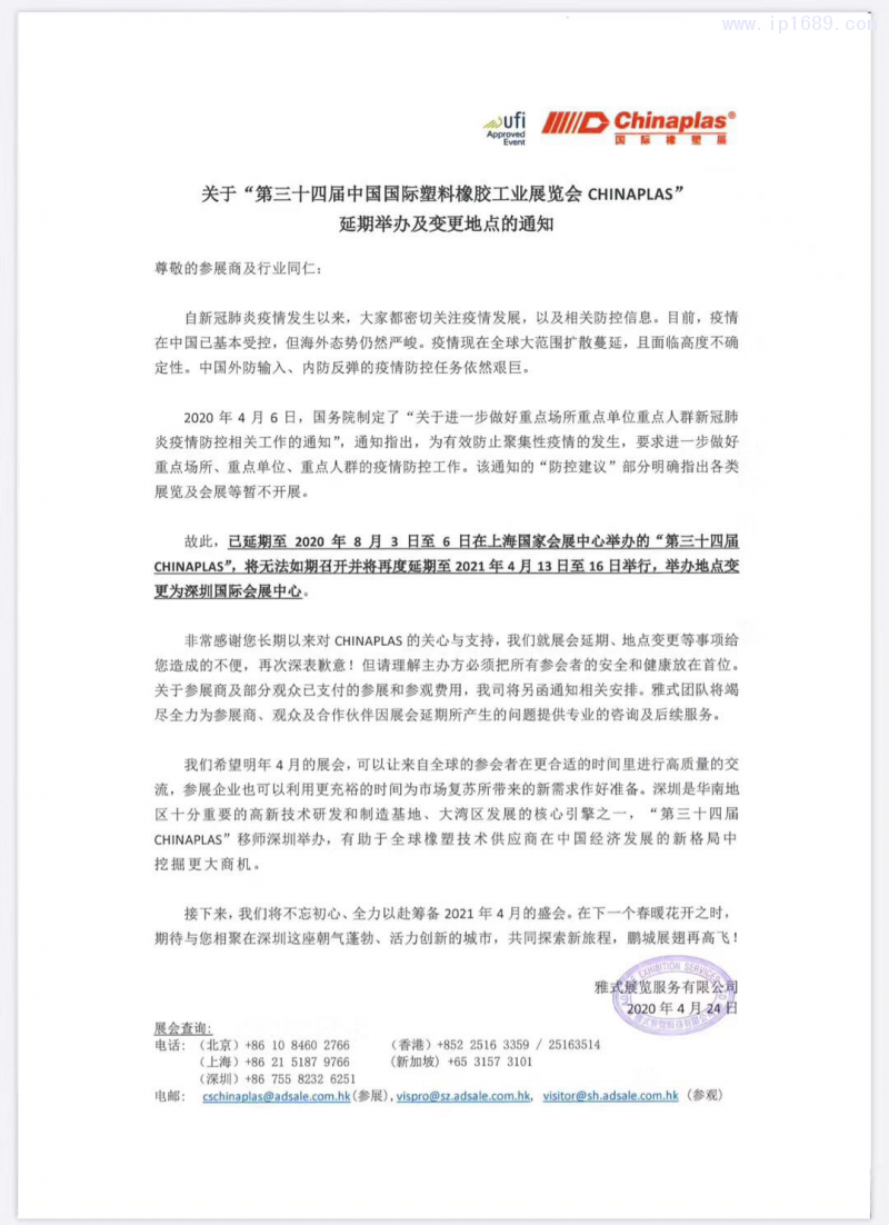 官方宣布!CHINAPLAS國際橡塑展延期至2021年4月13至16日將移師深圳國際會展中心