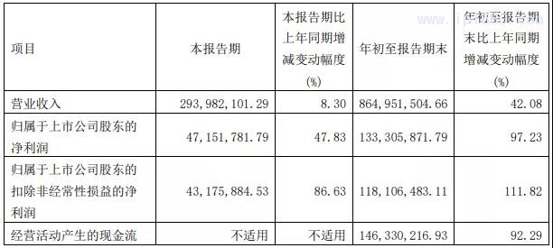 泰瑞機(jī)器股份有限公司(簡稱“泰瑞”)于2021年10月22日披露的三季報顯示,2021年前三季度公司實現(xiàn)營業(yè)總收入8.6億元,同比增長42.1%;實現(xiàn)歸母凈利潤1.3億,同比增長97.2%;每股收益為0.47元。其中,2021第三季度實現(xiàn)營業(yè)收入為2.9億元,歸屬上市股東凈利潤為47151781.79元。