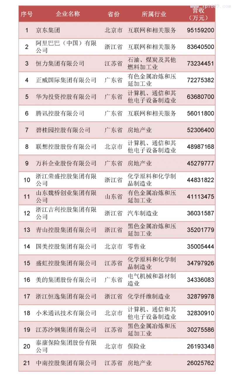 19家500強(qiáng)企業(yè)營(yíng)業(yè)收入超3000億元,京東集團(tuán)(9515.92億元)、阿里巴巴(中國(guó))有限公司(8364.05億元)、恒力集團(tuán)有限公司(7323.45億元)、正威國(guó)際集團(tuán)有限公司(7227.54億元)、華為投資控股有限公司(6368.07億元)等5家企業(yè)營(yíng)業(yè)收入超過(guò)6000億元。