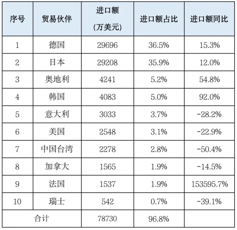 從進(jìn)口來源地看,1季度,中國大陸從42個(gè)國家或地區(qū)進(jìn)口塑料機(jī)械,進(jìn)口來源地前10位占同期塑機(jī)進(jìn)口額的97%,其中,從德國、日本、奧地利的進(jìn)口額位列前三名,占同期塑機(jī)進(jìn)口額的比例分別為37%、36%、5%;韓國、意大利、美國、中國臺(tái)灣、加拿大、法國、瑞士等位居前10。