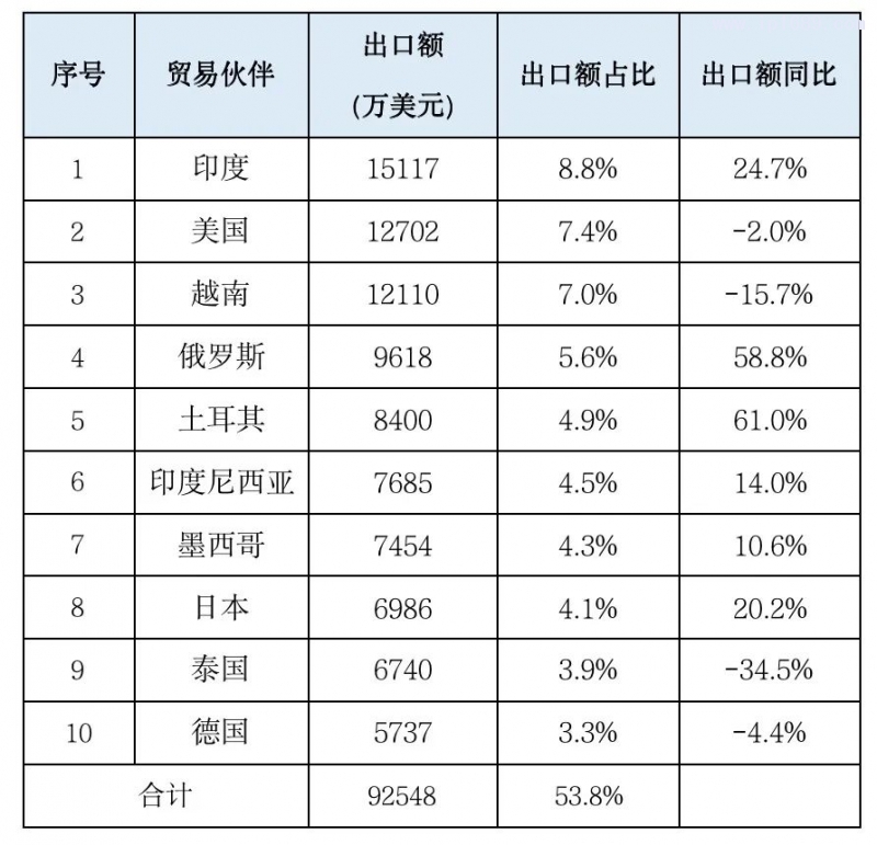 從出口國別看,1季度,中國大陸向194個(gè)國家或地區(qū)出口塑料機(jī)械,其中,前10大市場(chǎng)出口額占同期塑機(jī)出口額的54%,向印度、美國、越南的出口額位列前三,占同期塑機(jī)出口額的比例分別為9%、7%、7%;俄羅斯、土耳其、印度尼西亞、墨西哥、日本、泰國、德國位居前10(詳見表3)。