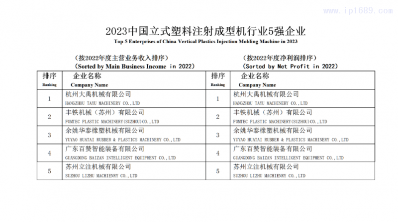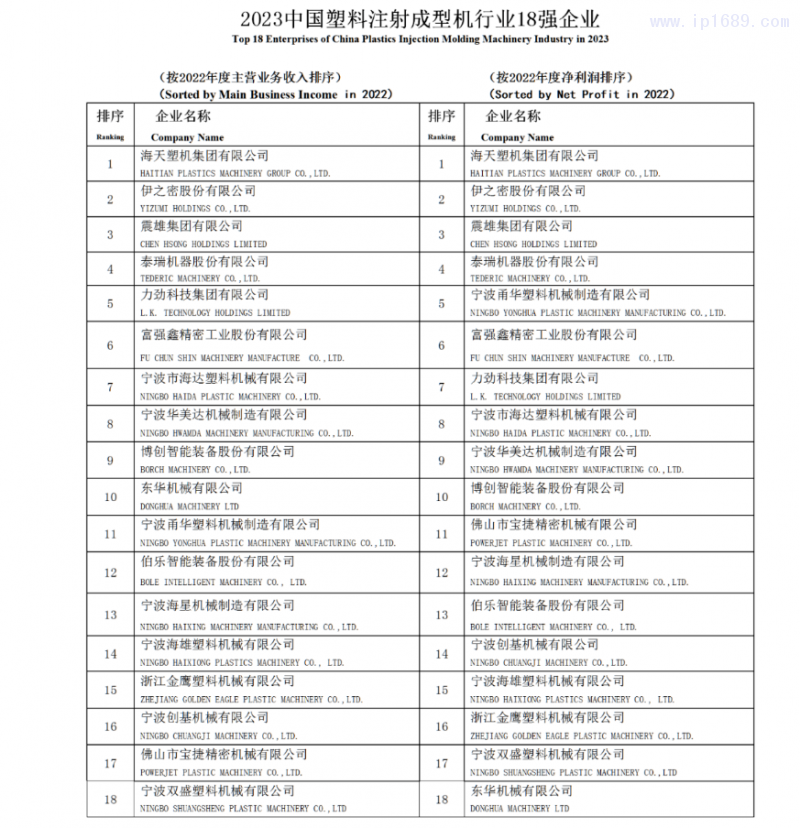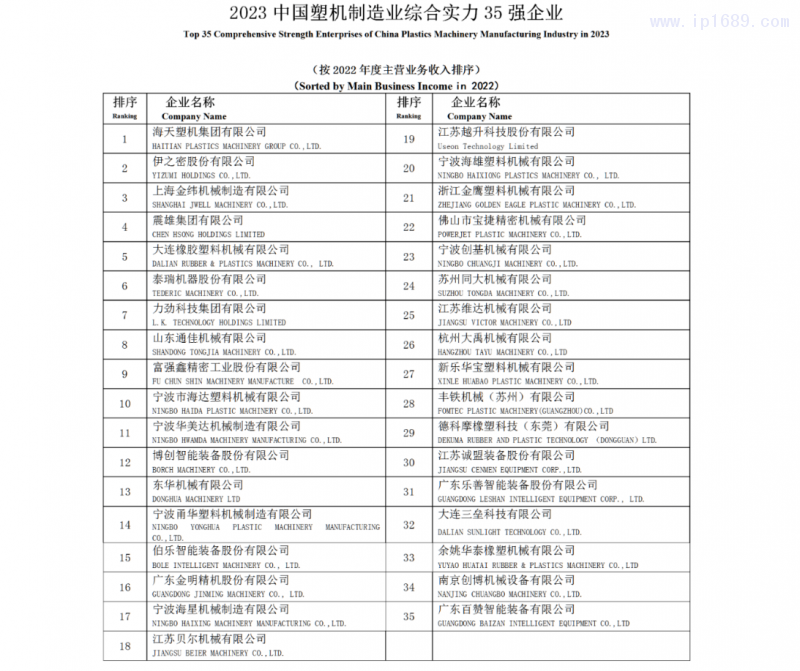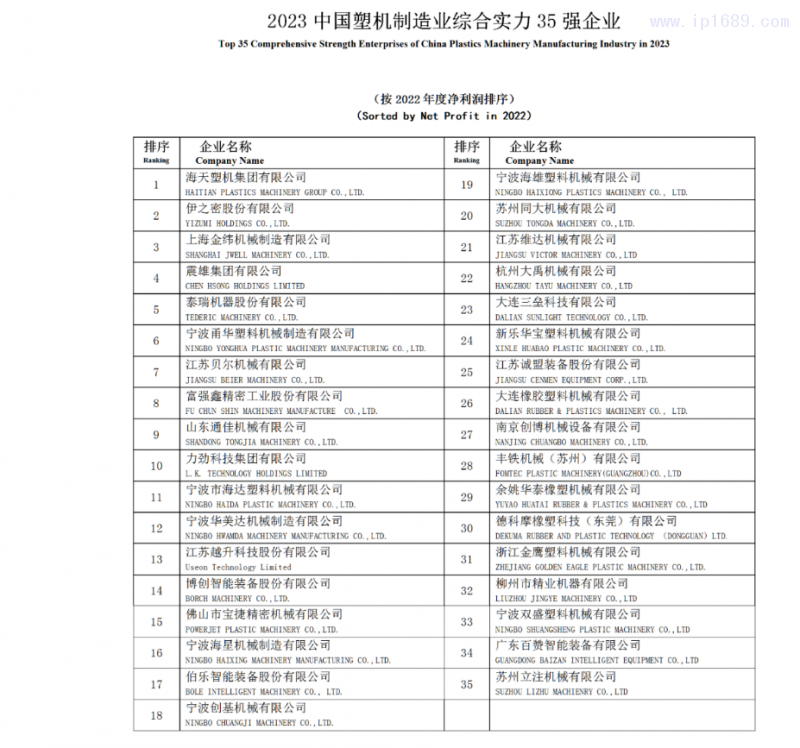 此次評(píng)選由中國(guó)塑料機(jī)械工業(yè)協(xié)會(huì)組織,本著“公平、公正、自愿”的原則,分別以“主營(yíng)業(yè)務(wù)收入”和“凈利潤(rùn)”為主要經(jīng)濟(jì)指標(biāo)進(jìn)行排序。根據(jù)各單位上報(bào)的 2022年度資料,經(jīng)相關(guān)部門(mén)審查和核實(shí),確定出“2023 中國(guó)塑機(jī)制造業(yè)綜合實(shí)力35強(qiáng)企業(yè)”、“2023中國(guó)塑料注射成型機(jī)行業(yè)18強(qiáng)企業(yè)”、“2023 中國(guó)塑料擠出成型機(jī)行業(yè)12 強(qiáng)企業(yè)”、“2023 中國(guó)塑料中空成型機(jī)行業(yè)5強(qiáng)企業(yè)”“2023中國(guó)立式塑料注射成型機(jī)行業(yè)5強(qiáng)企業(yè)”和“2023中國(guó)塑機(jī)輔機(jī)及配套件行業(yè)7強(qiáng)企業(yè)”入選名單。