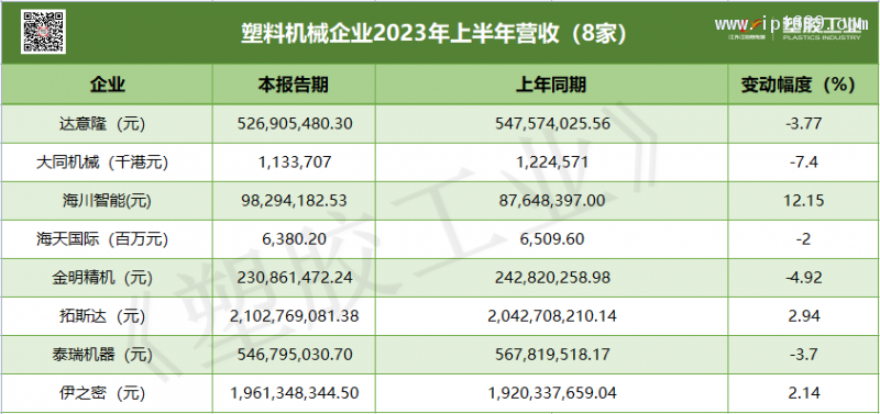 8家上市塑料機(jī)械企業(yè)營收數(shù)據(jù)中,只有海川智能、拓斯達(dá)和伊之密3家呈現(xiàn)上漲趨勢。