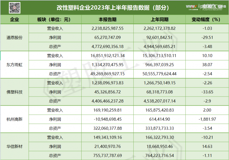值得一提的是,改性塑料企業(yè)2023年上半年財報營收和總資產(chǎn)兩大板塊中,東方雨虹均超過百億元:營收約168.52億、總資產(chǎn)約492.7億;金發(fā)科技更是直超200億元:營收約203.49億,總資產(chǎn)約581.09億。