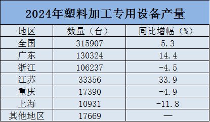 從我國塑料加工專用設(shè)備來看,產(chǎn)能主要集中在東部地區(qū),廣東與浙江兩省產(chǎn)量占據(jù)全國產(chǎn)量的七成以上。2024年,在大規(guī)模設(shè)備更新行動(dòng)方案等政策以及出口增長影響下,全國塑料加工專用設(shè)備產(chǎn)量有所提升,同比增長5.3%。