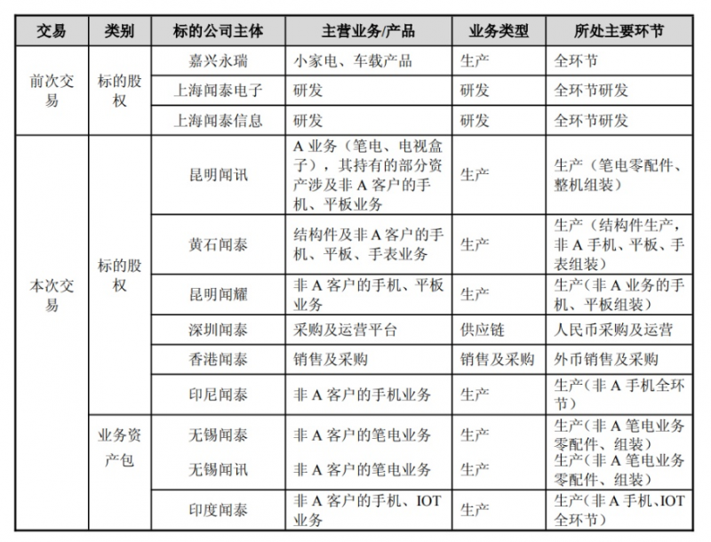 據(jù)聞泰科技披露,前次交易標(biāo)的涵蓋嘉興永瑞(小家電、車載產(chǎn)品)、上海聞泰電子(研發(fā))、上海聞泰信息(研發(fā))共3家子公司的股權(quán)。本次交易標(biāo)的則包括昆明聞?dòng)崳ˋ業(yè)務(wù)及部分非A業(yè)務(wù))、黃石聞泰(結(jié)構(gòu)件及非A客戶業(yè)務(wù))、昆明聞耀(非A客戶業(yè)務(wù))、深圳聞泰(采購及運(yùn)營平臺(tái))、香港聞泰(銷售及采購)、印尼聞泰(非A客戶的手機(jī)業(yè)務(wù))的股權(quán),以及無錫聞泰、無錫聞?dòng)?、印度聞泰?家子公司的業(yè)務(wù)資產(chǎn)包。