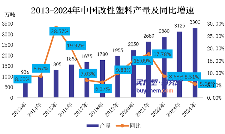 從行業(yè)數(shù)據(jù)來看,中國改性塑料市場規(guī)模持續(xù)增長。據(jù)買化塑研究院監(jiān)測,2024年中國改性塑料產量達3300萬噸,較2023年增長5.6%。