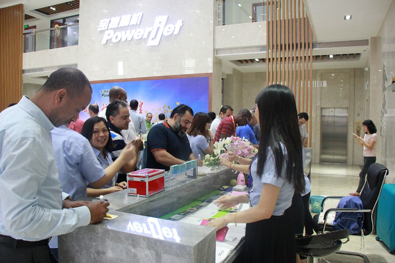 雨過天晴,清風(fēng)徐來。當(dāng)天一大早,客戶們便陸續(xù)搭乘寶捷專用接待車陸續(xù)來到新工廠,在接待大廳簽名,并將簽名金葉粘貼在發(fā)財樹上,寓意財運(yùn)旺盛,四通八達(dá),生意興隆,蒸蒸日上。在接待大廳我們還看到一群群外國友人前來觀摩,老客戶、新客戶、行業(yè)友人、媒體友人,熙熙攘攘,好不熱鬧。待簽到結(jié)束后,大家聚在一起,一同在發(fā)財樹前合影留念。