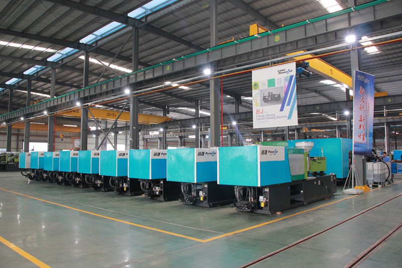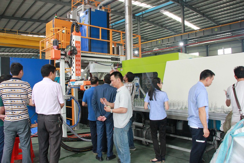 中午在寶捷工作人員的安排下我們用過午餐,按照指引路線開始參觀寶捷新工廠和生產(chǎn)車間。生產(chǎn)車間內(nèi),除了一排排整齊擺放的成品或半成品設(shè)備外,還在車間設(shè)有演示區(qū),現(xiàn)場演示的有JEV-380油電混合快速注塑機(jī)、KF380-S8高速薄壁專用注塑機(jī)、HPET4500-V6高速瓶胚專用注塑機(jī)以及EB25H65S2全自動雙工位擠出吹瓶機(jī),每一款設(shè)備都傳承了寶捷注塑、吹塑方面的先進(jìn)工藝技術(shù),融合了現(xiàn)代創(chuàng)新的技術(shù)成果,是針對不同細(xì)分專業(yè)市場的高端、精密、成本優(yōu)的整體塑造成型解決方案。這幾款設(shè)備也是寶捷新工廠搬遷后率先推出的新產(chǎn)品,其中高速薄壁專用機(jī)采用創(chuàng)新設(shè)計,運(yùn)用領(lǐng)先的液壓系統(tǒng)實(shí)現(xiàn)低壓注射,具有機(jī)械保護(hù)好、模具壽命長、產(chǎn)品應(yīng)力小、變形小等特點(diǎn)。高速瓶胚專用機(jī)則采用伺服液壓控制注射,精準(zhǔn)快速,擁有48個模腔,生產(chǎn)周期僅8秒內(nèi)就可以完成?,F(xiàn)場技術(shù)人員還耐心地向我們講解了瓶胚壓膜過程,進(jìn)一步介紹了由瓶胚到最終瓶子的拉伸、吹塑過程,讓我們對注塑工藝和整個生產(chǎn)流程有了更深入的認(rèn)識。