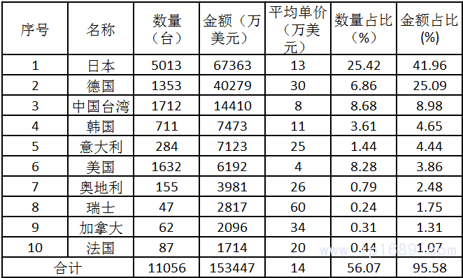 表5、2017年1-11月我國塑機(jī)進(jìn)口地排名前10位