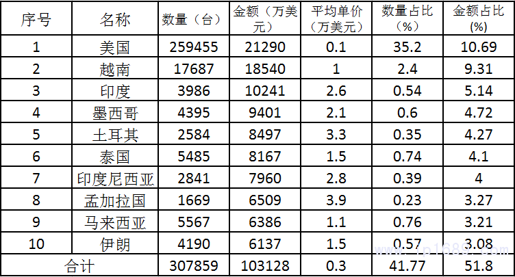注塑機(jī)出口25752臺(tái)、10.45億美元,分別同比增長5%、14%;擠出機(jī)出口26748臺(tái),同比下降36%,金額約3.78億美元,同比增長7%;吹塑機(jī)出口31680臺(tái),金額1.87億美元,分別同比增長315%、13%;塑料中空成型機(jī)出口1320臺(tái),同比增長3%,金額4573萬美元,與上年持平;塑料壓延成型機(jī)出口1369臺(tái)、金額2823萬美元,分別同比增長31%、12%。