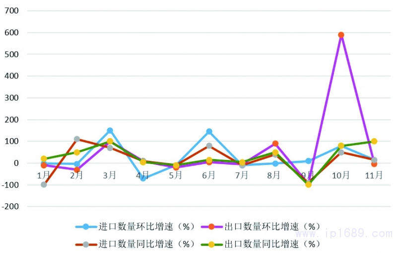 圖2 2017年1-11月我國塑機(jī)進(jìn)出口數(shù)量增速走勢