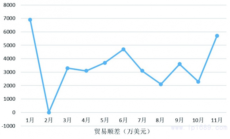 圖4 2017年1-11月我國塑機(jī)貿(mào)易順差走勢