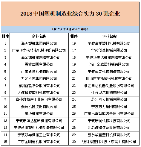 根據(jù)各單位上報(bào)的2017年度資料,經(jīng)相關(guān)部門審查和核實(shí),確定出“2018中國塑機(jī)制造業(yè)綜合實(shí)力30強(qiáng)企業(yè)”“2018中國塑料注射成型機(jī)行業(yè)15強(qiáng)企業(yè)”“2018中國塑料擠出成型機(jī)行業(yè)10強(qiáng)企業(yè)”“2018中國塑料中空成型機(jī)行業(yè)3強(qiáng)企業(yè)”和“2018中國塑機(jī)輔機(jī)及配套件行業(yè)5強(qiáng)企業(yè)”入選名單。