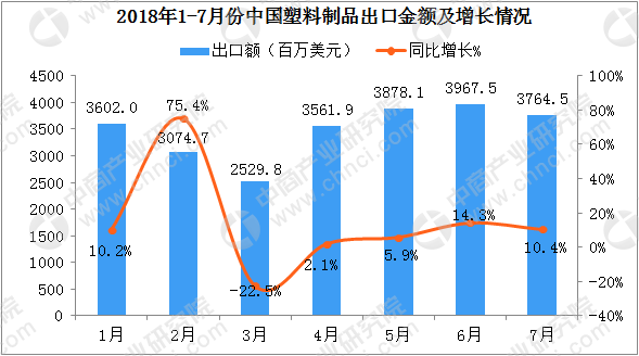 從金額方面來看,2018年1月-2月我國塑料制品出口金額明顯下降,2018年2月我國塑料制品出口金額為3074.7百萬美元,同比增長75.4%。2018年3月我國塑料制品出口金額繼續(xù)下降,2018年3月我國塑料制品出口金額為2529.8百萬美元,同比下降22.5%。2018年3月-6月我國塑料制品出口金額持續(xù)上升,2018年7月我國塑料制品出口金額為3764.5百萬美元,同比增長10.4%。2018年1月-7月我國塑料制品出口金額同比增長11.5%。